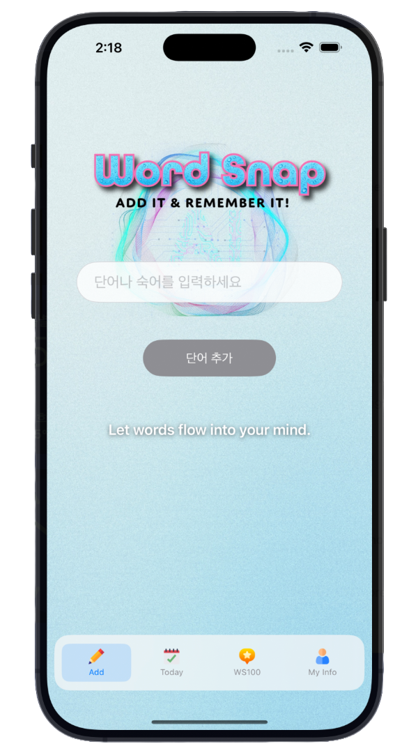 WordSnap AI는 영어 단어를 입력하기만 하면, AI가 자동으로 뜻, 예문, 해설을 생성해주는 스마트 단어 학습 앱입니다. 원어민 음성 발음을 들으며 단어를 익히고, 개인의 학습 이력을 기반으로 한 복습 주기 시스템과 몰입형 플래시 학습 모드(AR 스마트글래스 모드 지원)를 통해 단어를 쉽고 오래 기억할 수 있습니다. 이제 종이로 된 단어 암기장은 버리세요. WordSnap AI로 간단히 단어를 추가하고, 바로 단어 학습을 시작하세요.